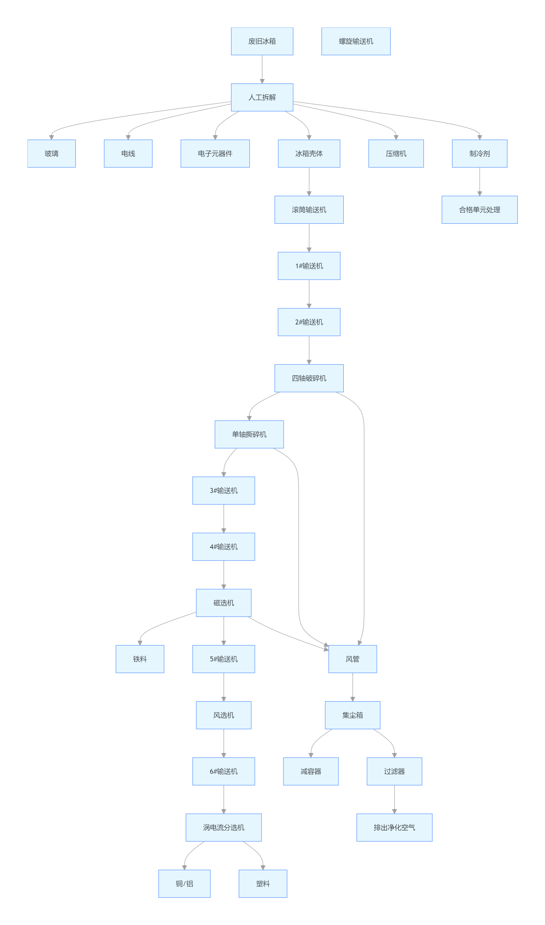 废旧冰箱回收生产线主要用于对已去除氟利昂和压缩机的冰箱进行破碎、分离和回收处理。该设备由PLC系统控制,可进行实时监控。其特点包括能源消耗低、容量大、成本效益高、维护成本低、产品质量优良等。